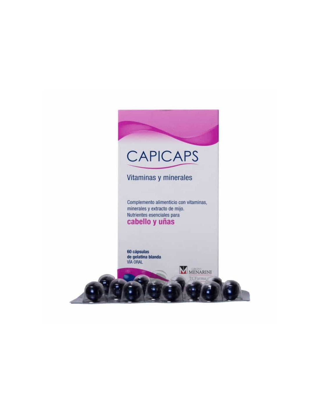 CAPICAPS es un complemento alimenticio que ayuda a nutrir, proteger y fortalecer las uñas y el cabello mediante la acción sinérgica de sus distintos componentes: ? Extracto de mijo rico en metionina. ? Vitaminas del grupo B. ? Ácido pantoténico que ayuda a disminuir el cansancio y la fatiga. Contribuye al metabolismo energético normal. ? La vitamina C contribuye a la formación normal de colágeno para el funcionamiento normal de la piel. ? La vitamina E contribuye a la protección de las células frente al daño oxidativo ? El magnesio contribuye al proceso de división celular y el hierro contribuye al metabolismo energético normal. ? Los ácidos grasos Omega 3 (EPA y DHA). ? La incorporación de zinc que contribuye al mantenimiento de la piel, cabello y uñas en condiciones normales. ? Además de biotina que contribuye al mantenimiento de la piel y el cabello en condiciones normales.