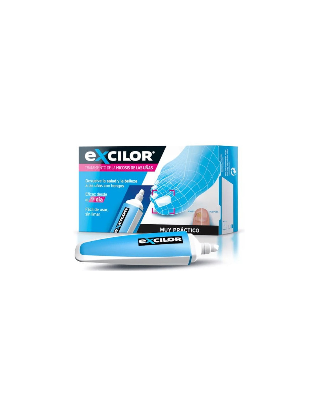 Penetra en la uña sin limar y actúa rápidamente para bloquear la progresión de la infección por hongos en la uña. Resultados visibles a partir de las dos semanas. Ayuda a reconstruir la estructura dañada de la uña. Esto mejora el aspecto cosmético de la uña y proporciona una barrera contra las infecciones micóticas de la uña. Las uñas crecen más sanas y fuertes, por lo que se previene la recontaminación. Contraindicaciones: Los pacientes diabéticos con problemas en los pies deben consultar con su médico antes de utilizar Excilor Evite el contacto con ojos y mucosas Efectos secundarios: Puede causar sensación de irritación, quemazón o dolor leve y local. Si persisten los o se agraban los síntomas, interrumpa el tratamiento y consulte a su médico o farmacéutico.