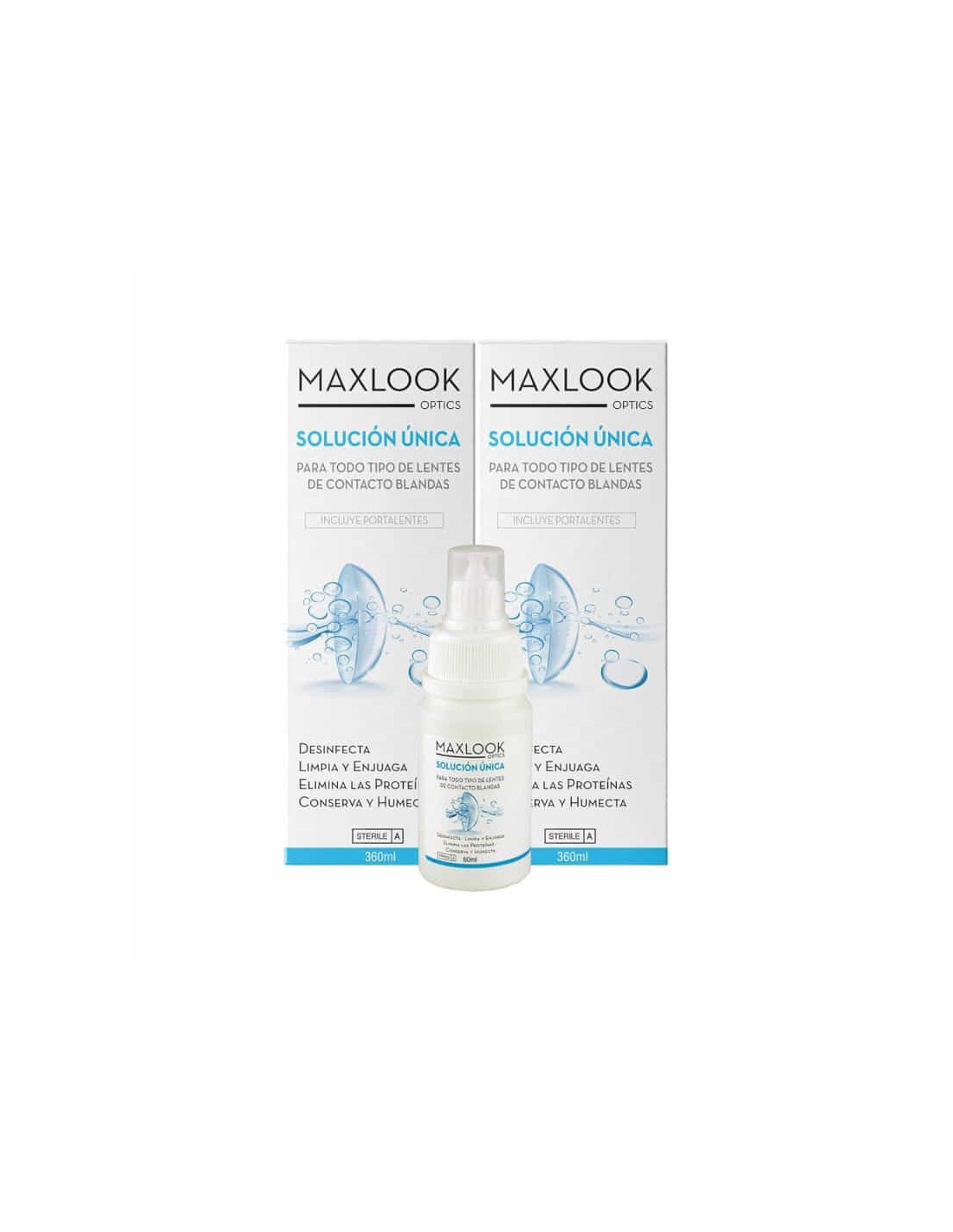 Maxlook Optics Duplo Solución Única 360 ml. + 360 ml. Solución única formulada para el cuidado e higiene de todo tipo de lentes de contacto blandas. Acciones: * Limpia y aclara. * Desinfecta. * Elimina las proteínas. * Mantiene la humedad.