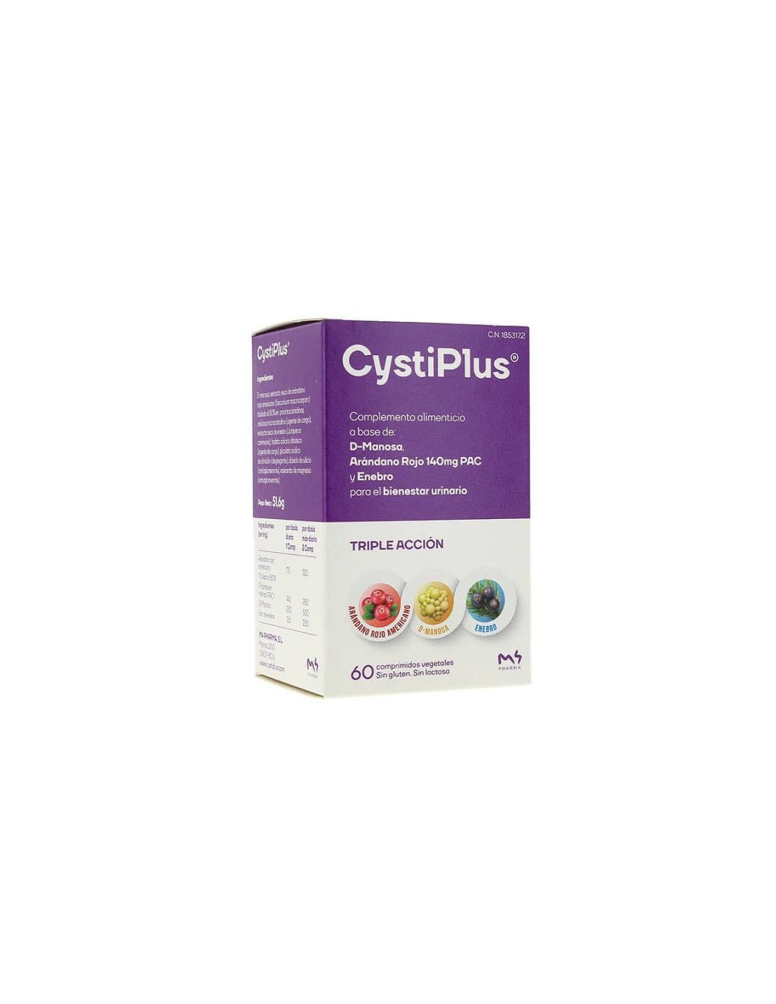 Cystiplus bienestar urinario es un complemento alimenticio a base de arándano rojo 140 mg PAC (proantocianidinas), D-manosa y enebro, para el bienestar urinario.