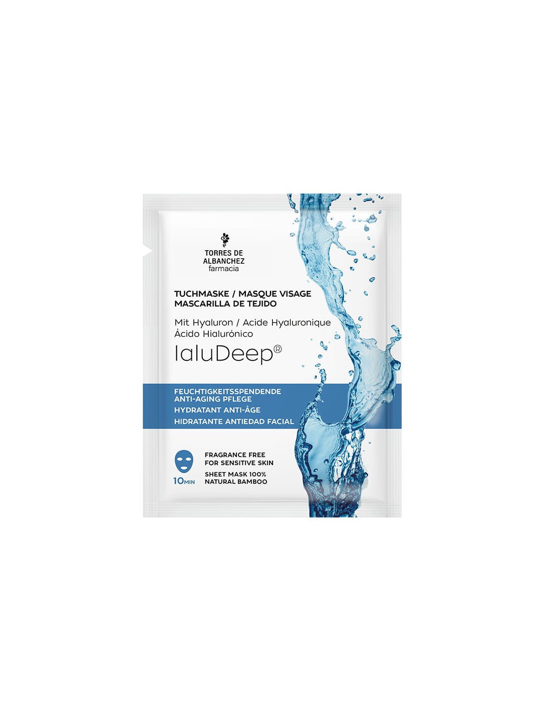 Mascarilla facial de acción hidratante y antiedad intensiva, en tejido de fibra de Bambú 100% natural. Concentrado en gel de Ácido Hialurónico IaluDeep®.