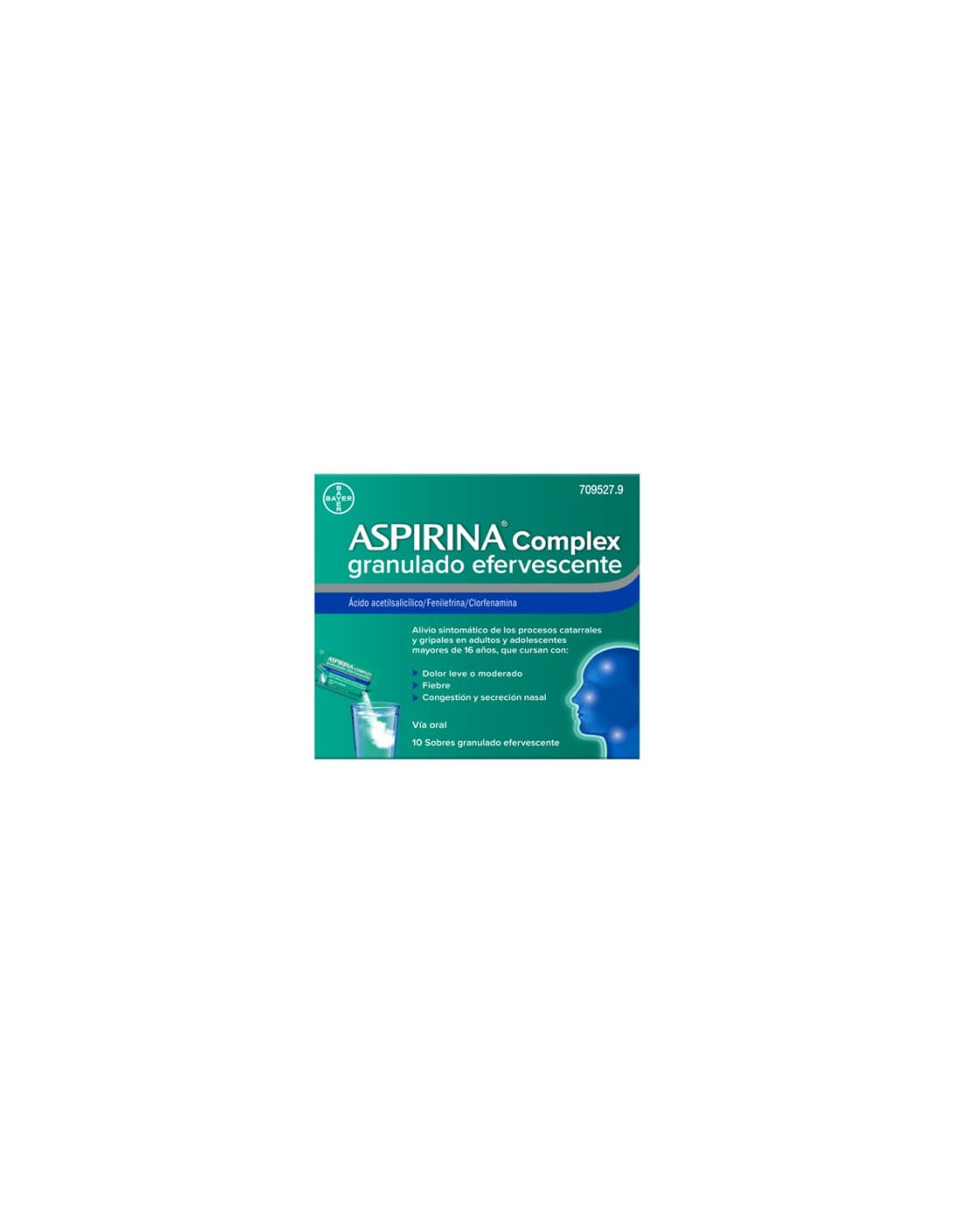 ASPIRINA COMPLEX granulado efervescente es una asociación de ácido acetilsalicílico, analgésico que actúa sobre el dolor y la fiebre, clorfenamina, antihistamínico que reduce el estornudo y el lagrimeo y fenilefrina, vasoconstrictor que actúa sobre la congestión nasal.